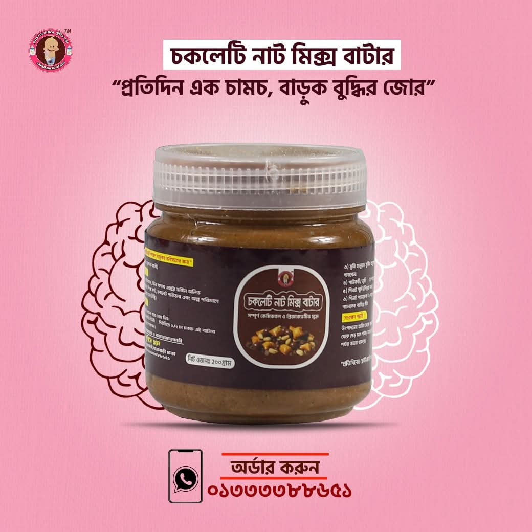 এই নাট বাটার প্রোটিন, স্বাস্থ্যকর ফ্যাট ও অ্যান্টিঅক্সিডেন্টে ভরপুর, যা শিশুর মস্তিষ্কের বিকাশ ও শক্তি বৃদ্ধিতে সহায়তা করে। চকলেটের মিষ্টতা বাচ্চাদের প্রিয়, যা তাদের খাওয়ার রুচি বাড়ায়। সহজে হজমযোগ্য এবং স্বাস্থ্যকর।